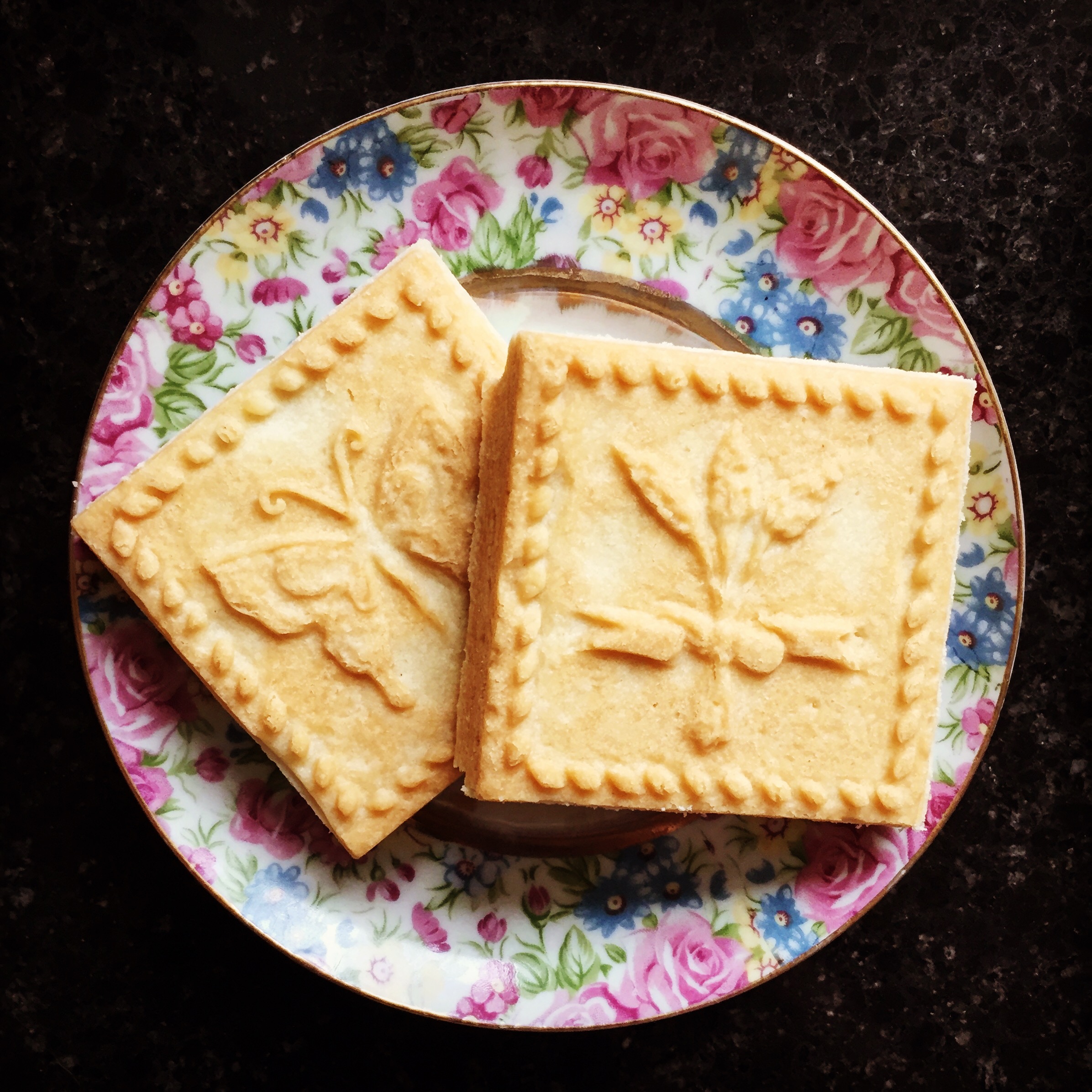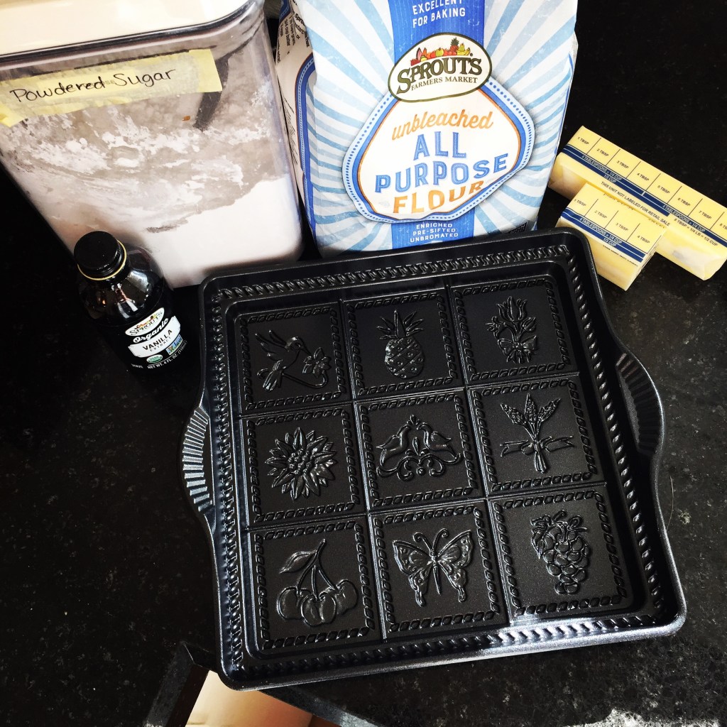 Because I had some time off work and was feeling crafty, I decided to make my own shortbread this year. I’ve done it before, but it had been a while (probably 10 years?) since I’d last made them. I have a few recipes for shortbread in my collection, but I decided to go with a slightly less traditional recipe that uses all icing/powdered sugar (no granulated sugar), as I wanted my cookies to be super silky and smooth. I also FINALLY broke out my shortbread/springerle pan, figuring it had been gathering enough dust that it was time to put it to use. Sadly, my pan/mold is not holiday themed – it’s spring themed! I decided that the spring theme worked, especially this year (2020…) – these cookies represent hopefulness for the new year to come 🙂